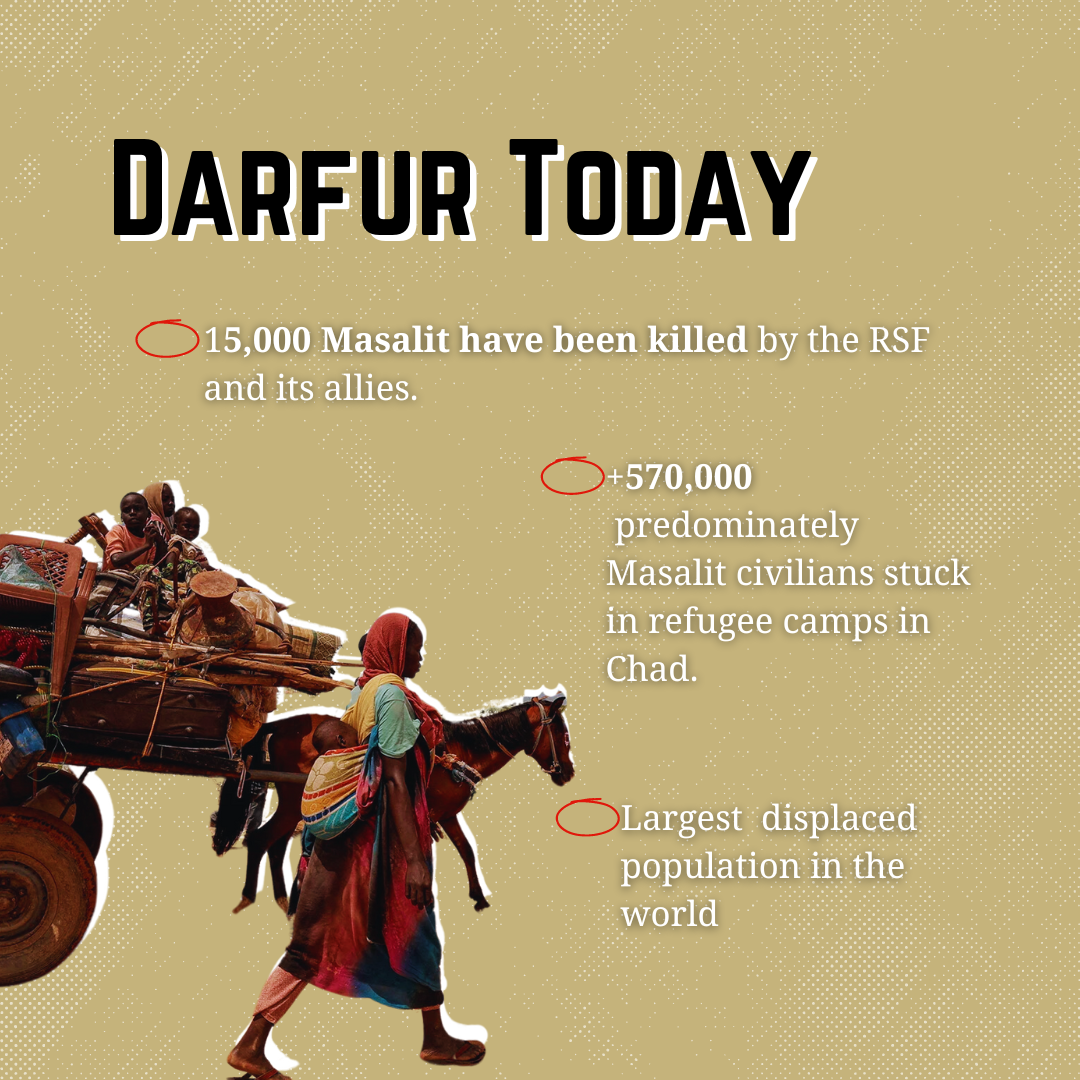Image of a mother on foot with a baby strapped to her back, alongside other children riding on top of a horse-drawn cart crammed between overflowing household belongings. Text that reads "Darfur today. 15,000 Masalit have been killed by the RSF and its allies. Over 570,000 predominately Masalit civilians stuck in refugee camps in Chad. Largest displaced population in the world."