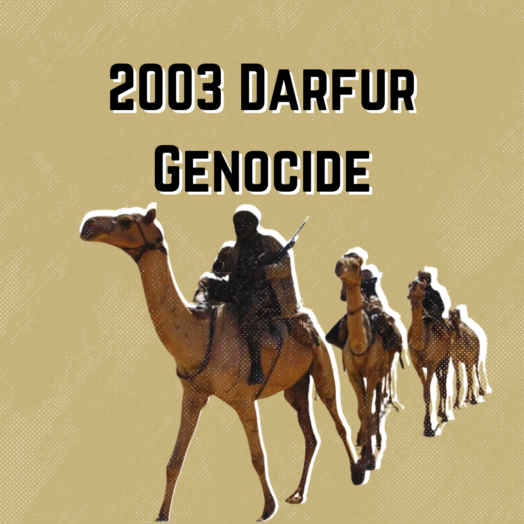 Image of Janjaweed militia (today known as the Rapid Support Forces (RSF)) riding camels wielding machine guns in Darfur region. Title text in bold black lettering reads "2003 Darfur Genocide."