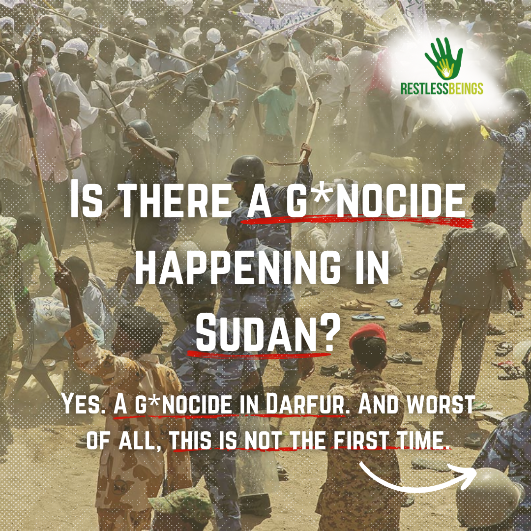 Image of Sudanese Armed Forces (SAF) soldiers and police raising batons above their heads with crowds of civilians surrounding them, and title text reads "Is There A Genocide Happening In Sudan? Yes. A Genocide In Darfur. And Worst Of All, This Is Not The First Time."