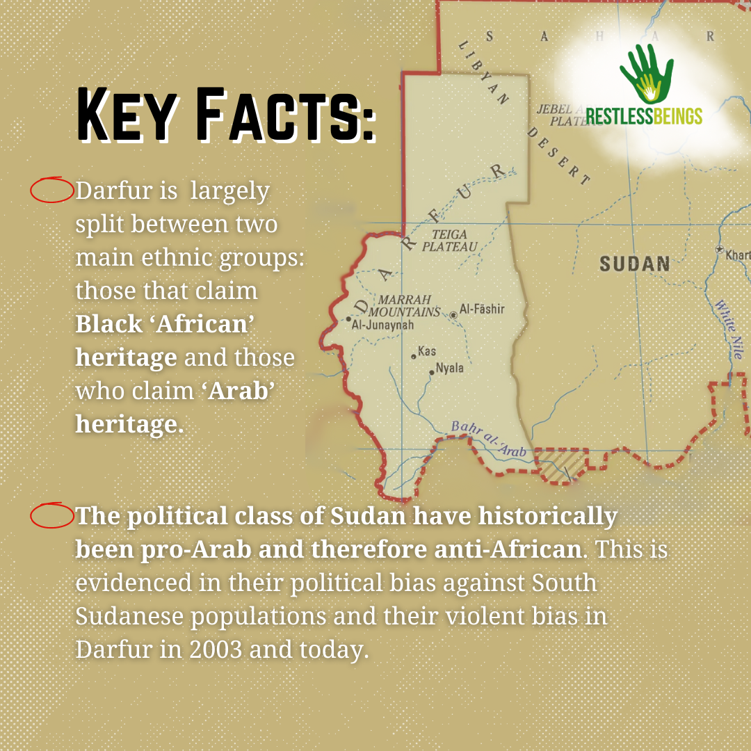 Image depicting the map of Sudan, with an outline and light shading over the Darfur region. Darfur is a region of western Sudan. The header in bold black lettering reads "Key Facts". Following, there are two bullet points under the header. The first reads, "Darfur is largely split between two main ethnic groups: those that claim Black African heritage, and those who claim Arab heritage". The second bullet point reads "The political class of Sudan have historically been pro-Arab and therefore anti-African. This is evidenced in their political bias against South Sudanese populations and their violent bias in Darfur in 2003 and today".