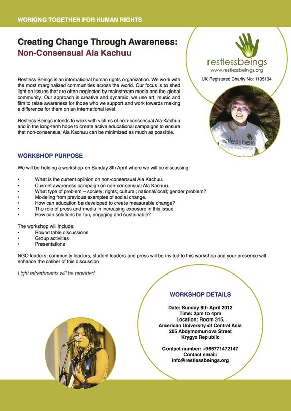 We plan to have this workshop a few days before we leave and this morning we got confirmation from The American University or Central Asia that they will allow us to host the event in one of their seminar rooms. The idea is that we bring the movers and shakers who are working with Ala Kachuu issue to discuss how we can move away from the stodgy type of awareness campaigns that are currently being held and to make them more imaginative and engaging for those that the campaign aims at – the youth. At the moment from all of our research we have found that whilst it is seen as something to be ashamed of, non consensual Ala Kachuu is still widely accepted. We are hoping that bringing the thinkers and campaign makers together to specifically talk about the best way to engage all parties will be able to take away from the workshop practical ways to make their campaigns more relevant for the intended audience. the poster is attached 🙂