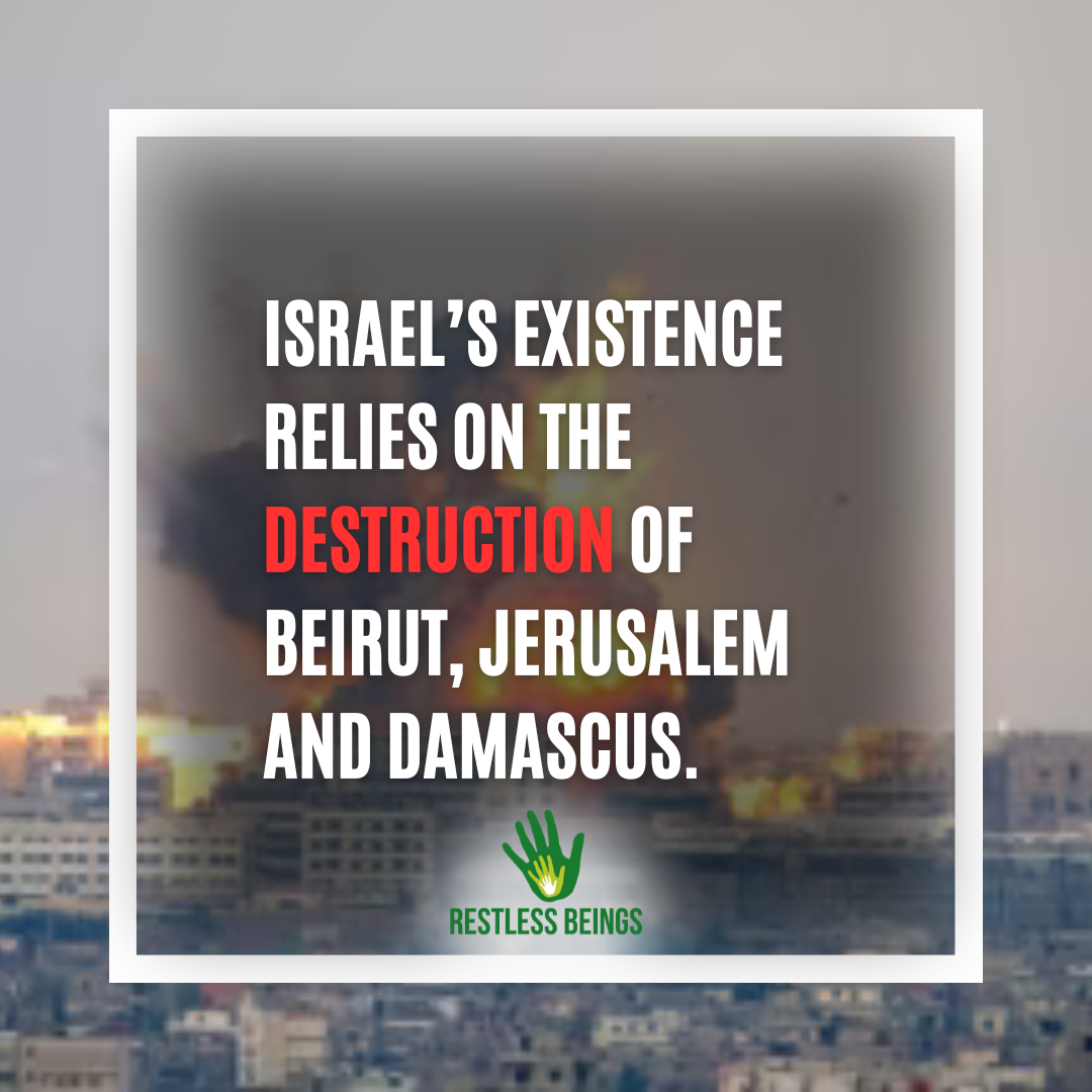For its creation, and sustenance, Israel as a State, has disrupted and occupied parts of Syria, Lebanon and of course, Palestine. The very heart of the old world is being torn apart by violence, as three of the world’s most sanctified cities –Beirut, Damascus, and Jerusalem– face devastation. These holy sites, historic metropolises with cultural and religious significance that touch the hearts and minds of millions, face irredeemable loss and ruin at the hands of the Israeli military and its allies. This chaos with no end in sight begs a haunting question: Is this suffering an inescapable consequence wrought by Israel’s very existence in the region?