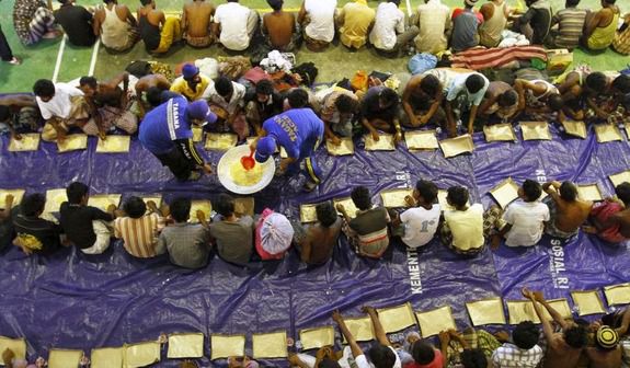 Indonesian Rescue Team members distribute food to Rohingya rescued from boats