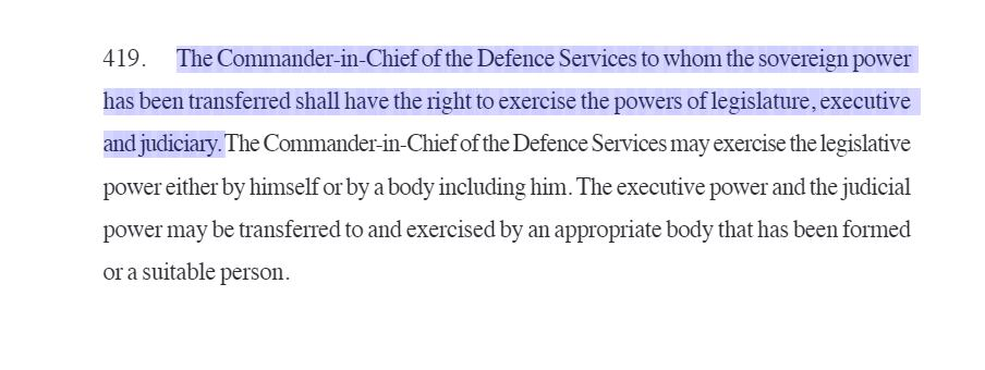 “The Commander in Chief of the Defence Services to whom the sovereign power has been transferred shall have the right to exercise the powers of legislature, executive and judiciary.”